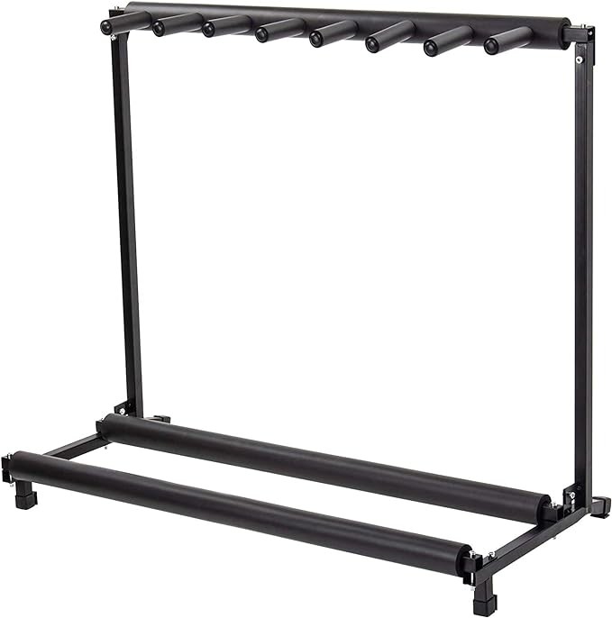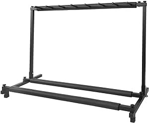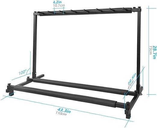 With its universal design, the stand caters to electric, classical acoustic, and bass guitars, offering a versatile solution for guitar enthusiasts with diverse instrument collections. Holding up to 7 guitars alongside bags or cases, this stand utilizes space efficiently in studios, rehearsal spaces, or on stage, promoting an organized and clutter-free environment Crafted with a robust metal frame and outfitted with rubber padding, the stand ensures secure placement of instruments, guarding against scratches and preventing potential breakage. The velveteen rubber padding on the neck and body rest provides gentle yet effective Safeguard, safeguarding guitars from scratches and preserving their pristine condition over time Featuring a collapsible design, the stand offers easy setup, breakdown, and portability, making it an ideal companion for gigs, rehearsals, or any Melodic endeavor requiring on-the-go convenience