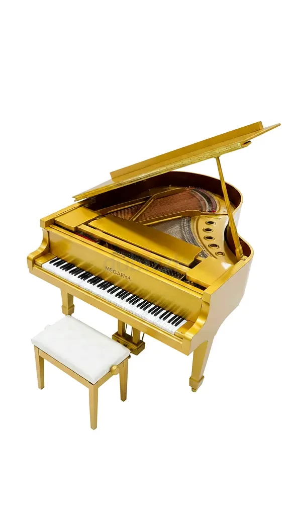 The Megarya Golden Grand Piano is more than just an instrument; it is a masterpiece of design. Known for its breathtaking Gold Leaf finish, this piano captures the light and becomes the focal point of any room. Whether you are a professional pianist or a discerning homeowner looking for the ultimate statement piece in Dubai, the Megarya Golden series offers unmatched presence and tonal depth.