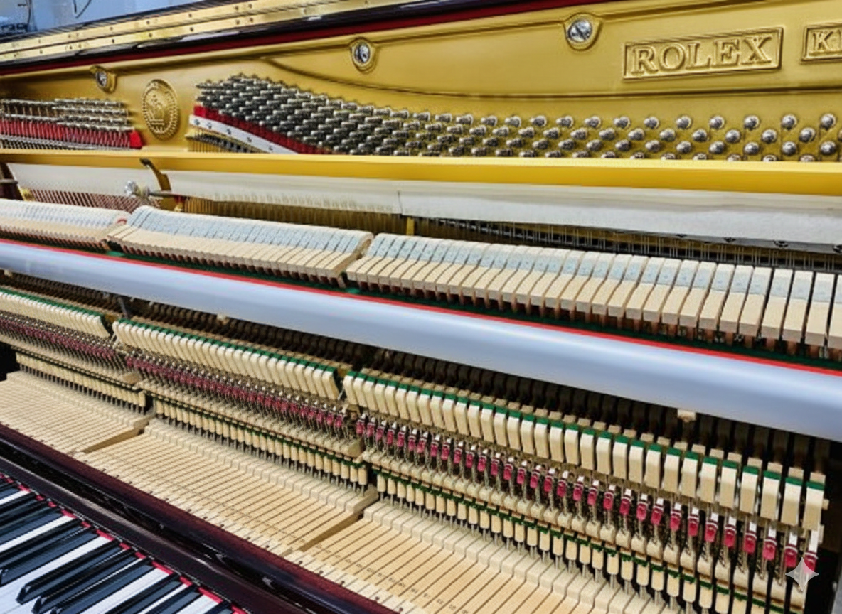 The Rolex upright piano offers a warm, balanced sound with responsive keyboard action, making it suitable for beginners, students, and professional players. Its compact upright design saves space while delivering a full and expressive piano tone.